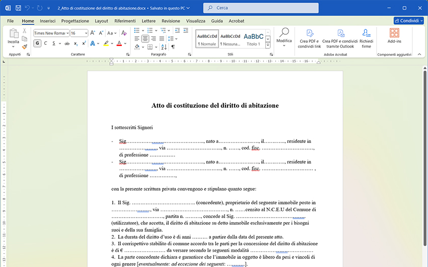 L’accordo tra il proprietario e chi usa l’immobile deve essere scritto e firmato tra le parti, per questo si parla di scrittura privata. È quindi necessario scrivere un documento che contenga tutti i dati delle persone coinvolte e il tipo di accordo del cosiddetto diritto di abitazione.