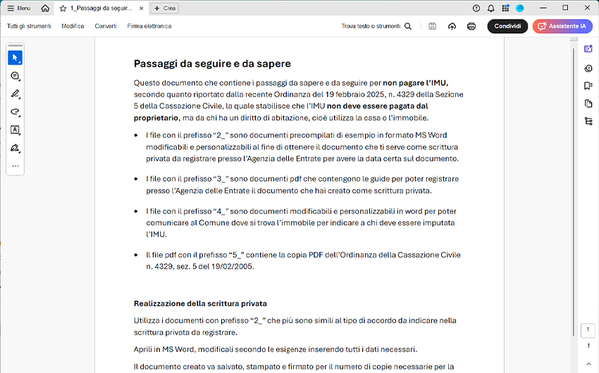 Nel pacchetto è fornita la copia pdf dell’Ordinanza della Cassazione Civile del 19 febbraio 2025, n. 4329 sez. 5, che è il riferimento legale per la procedura da seguire per non pagare più l'IMU come proprietario.